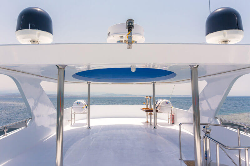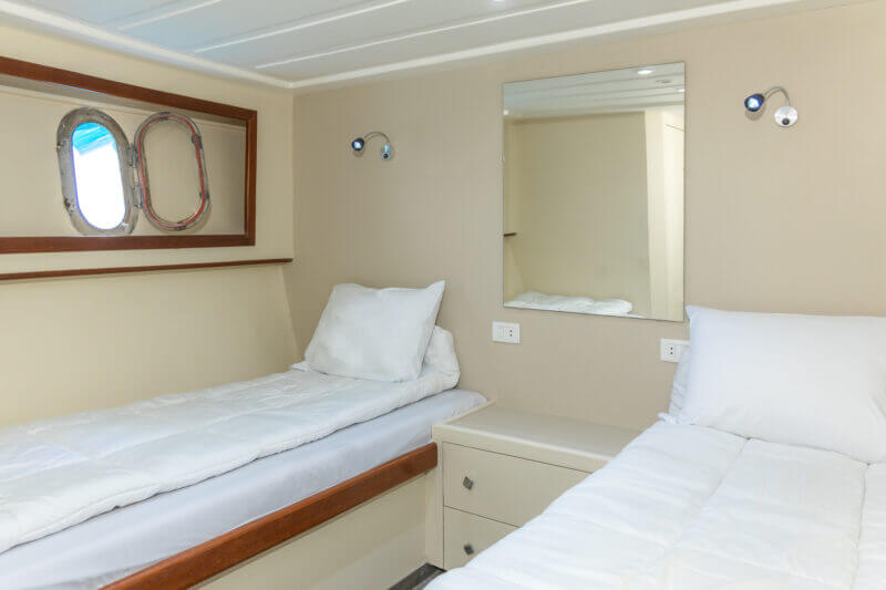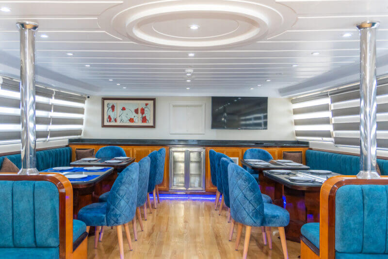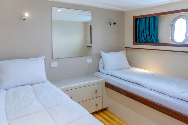 Entièrement rénové en 2024, notre bateau offre un espace de vie lumineux et moderne pouvant accueillir jusqu’à 20 personnes dans 10 cabines. Le pont inférieur compte 6 cabines standard avec lits jumeaux côte à côte, et le pont supérieur 4 autres cabines standard avec lits jumeaux côte à côte. Toutes les cabines disposent d’une salle de bain attenante, de la climatisation et d’un espace de rangement. Sur le pont principal se trouvent une salle à manger et un salon climatisé, lumineux et moderne. Le pont supérieur abrite un salon et un bar extérieur, l’endroit idéal pour se retrouver. Le pont supérieur dispose d’une grande terrasse ensoleillée partiellement ombragée avec chaises longues.